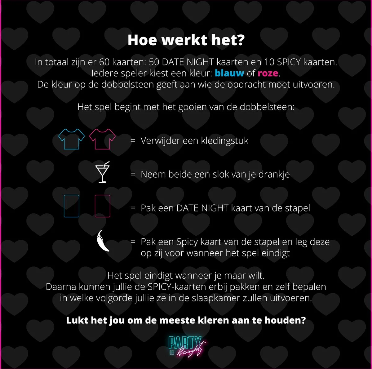 Het spel draait om de dobbelsteen. Allereerst kiezen jullie beiden een kleur: blauw of roze, vervolgens gooien jullie om de beurt de dobbelsteen. Deze vraagt je om óf een kaart te trekken óf een kledingstuk uit te trekken óf een slokje te nemen. Degene die aan het eind van het spel nog de meeste kleding aan heeft, wint!